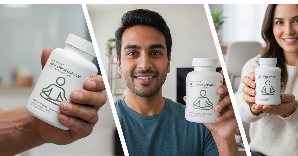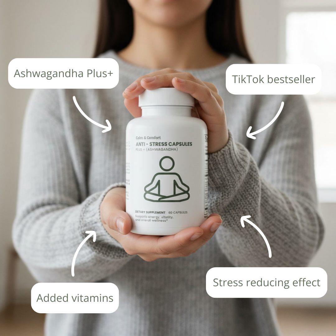 Our Calm & Comfort anti-stress formula is carefully developed to support everyday stress balance. Recommended by professionals, it combines adaptogens and essential nutrients to help reduce everyday stress and promote calm and mental clarity. Simply take two capsules a day. Each bottle contains 60 capsules, providing a full month of daily support.